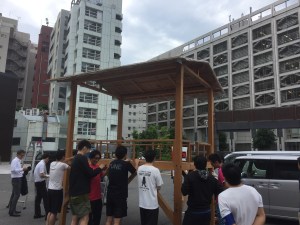 小雨の降りしきる中、約2時間かけて、無事櫓の設営を終えました。